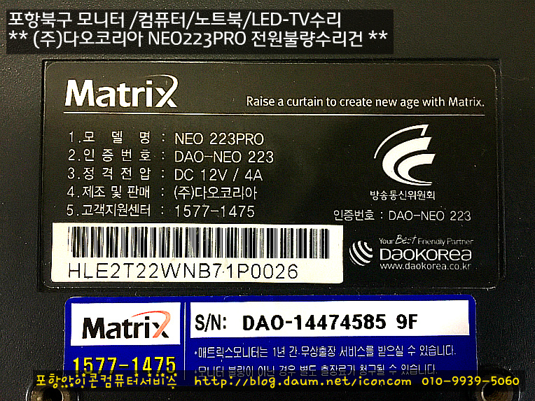 | 상대동에서 삼성22인치 화면이 나왔다가 꺼져요!!(포항북구모니터수리-아이콘컴퓨터서비스) (0) | 2017.01.10 |